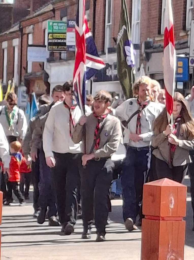Mafeking Explorer Scout Unit took part in the St Georges Day Parade, leading the column as flag bearers through the centre of Swadlincote. All of the groups from the South Derbyshire district were invited, so the parade consisted of a whole range of young people, from Squirrels (aged 4-6) through to the Explorers and Young Leaders.